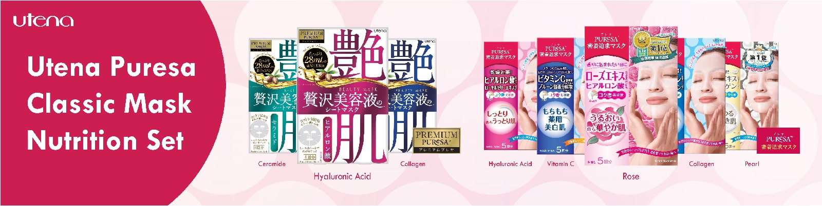 Utena Puresa classics mask nutrition set contains 8 different kind of masks, including Rose, Pearl, Sakura, Vitamin C, Hyaluronic Acid, Collagen, Ceramide and Coenzyme Q-10.